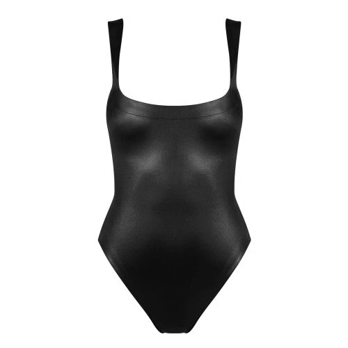 Andres Sarda Bardi Tank Swimsuit – 1 piece swimming costume, 100% made with the calendered article. Straight neckline and personalized shapes on the straps. The structure of the pattern enhances the bust. Available in sizes XS-L. An intense black that simulates leather.