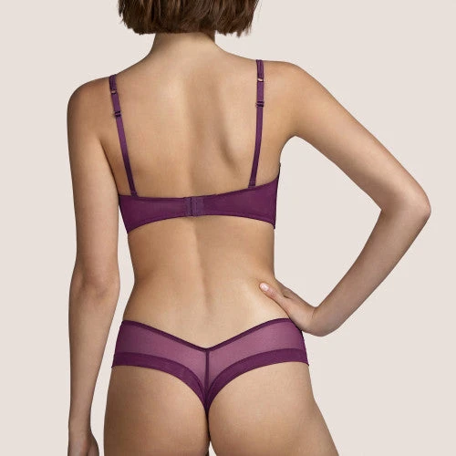 Andres Sarda Ella Luxury Thong – Image body, spectacular, a truly stunning garment. The use of tulle in different ways for the lining creates a spectacular transparent effect, finished with Swarovski stone detailing for an unexpected, eye-catching, elegant look. The color tournaline is an eggplant shade perfect for all skin tones.