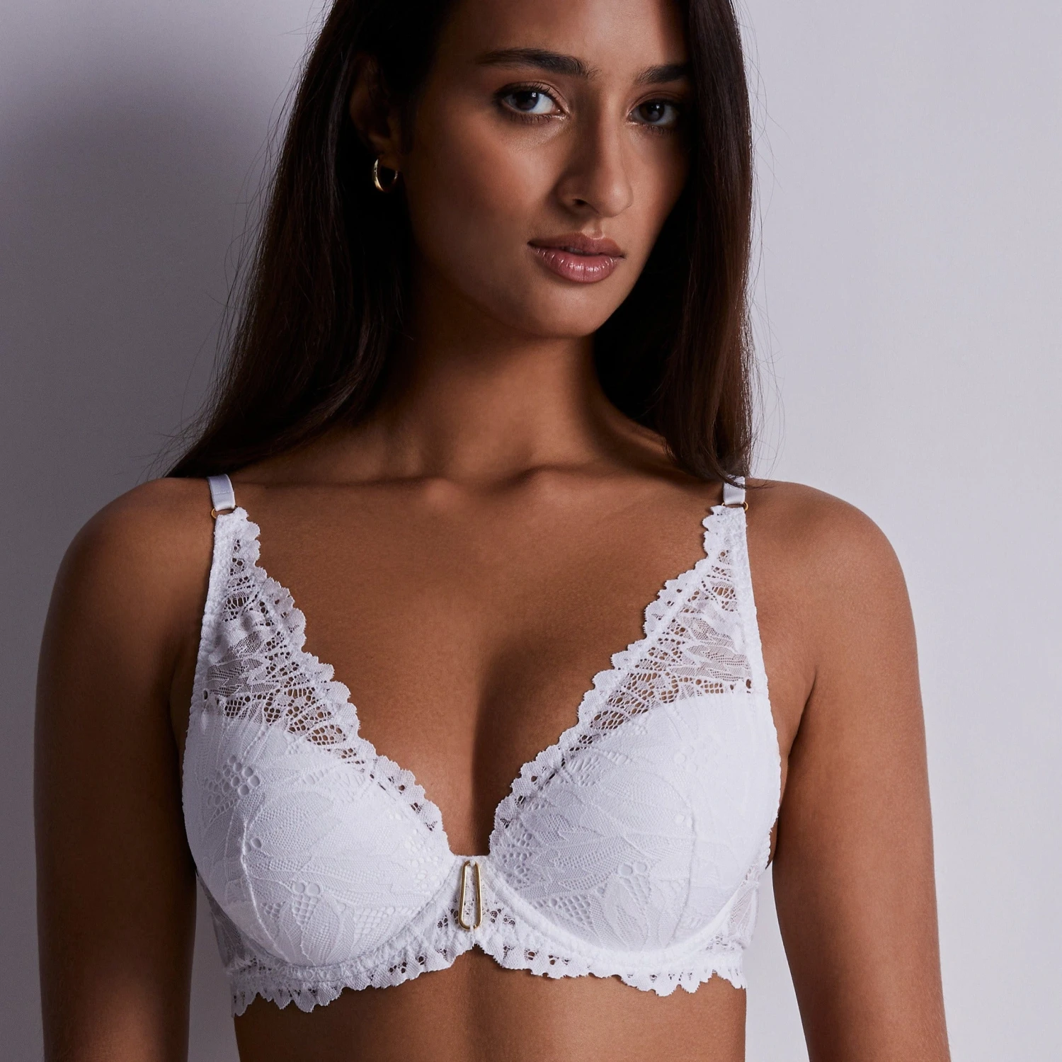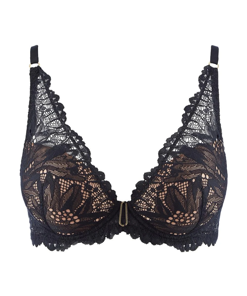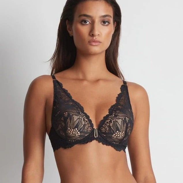 Aubade Flowermania Padded Plunge Bra – Plunging, comfortable and sexy, the Flowermania shoulder plunge bra structures the entire chest area with lace that features exotic floral patterns on transparent tulle extending up towards the shoulders. It has moulded cups to provide maximum support for a natural push-up effect that shapes the bust. With a pretty trim extending from the centrepiece all around the edge of the band, it looks fabulous peeping out from beneath a V-neck vest top for an adventurous look.