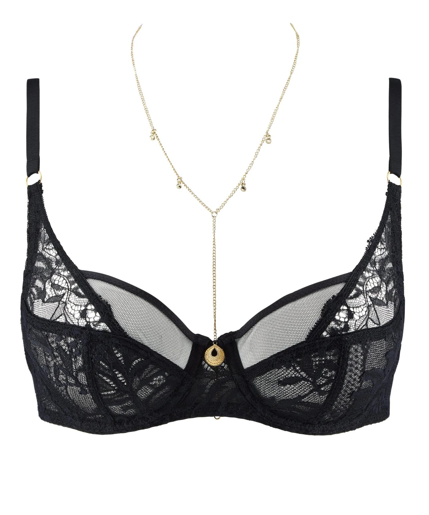 Aubade Gold Pleasure Luxury Full Balcony Bra – An elegant full lace line that plays with luxury codes and sensual features. The enchanting floral design of the lace and mesh reveal the skin and the graphic scalloping showcases this line’s refined look. Each piece is embellished with a delicate, sensual chain which elevates the necklines of the bras and adds gold detailing to the briefs. This stunning jewellery featuring small removable charms can be worn whenever you feel like it.