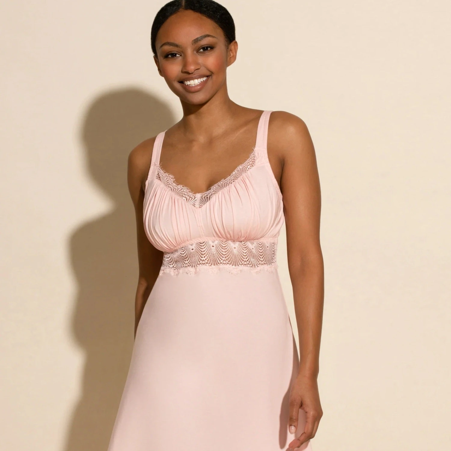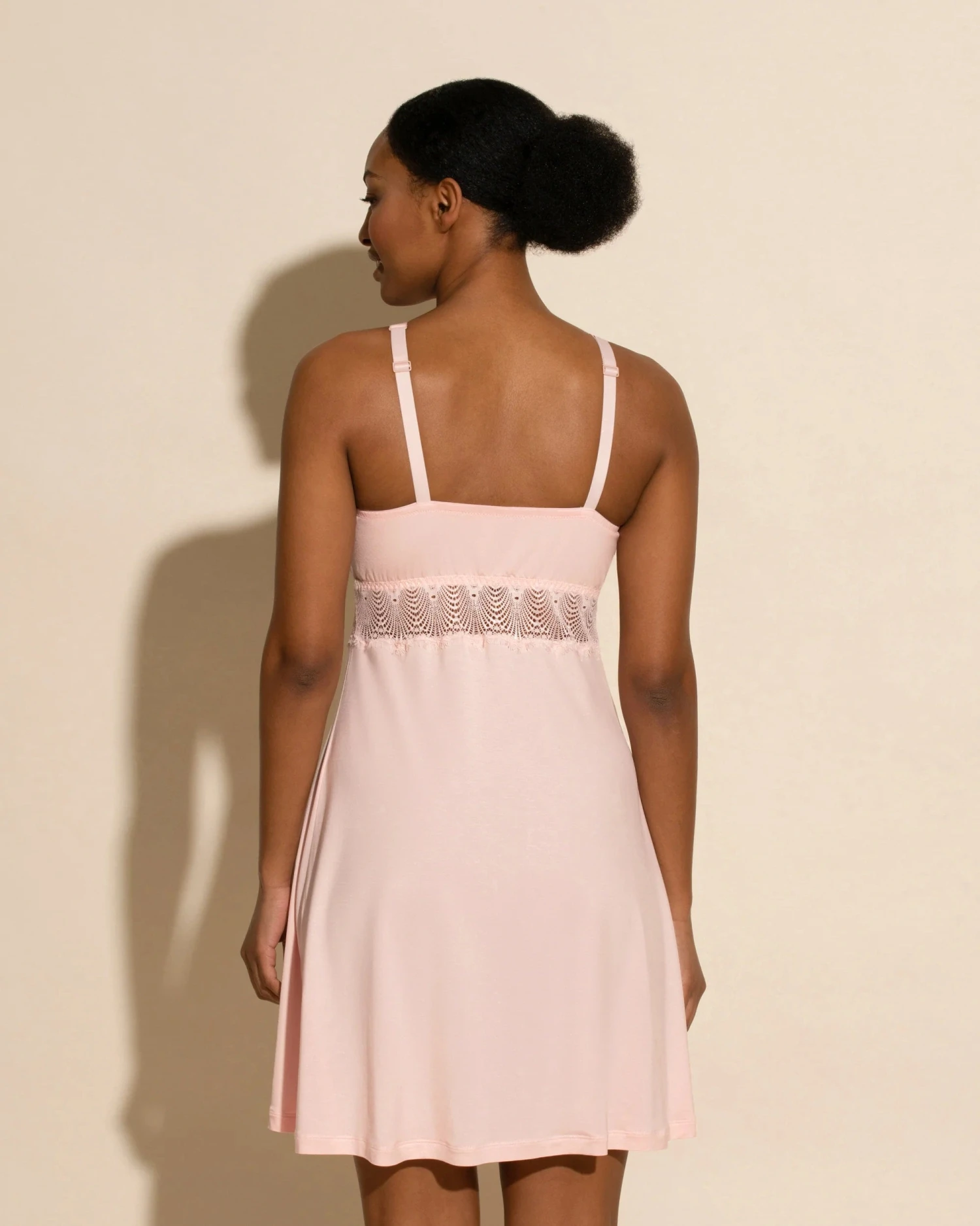Chemise designed and uniquely sized for those with smaller frames paired with full busts. Elegant, eyelash lace with geometric detail at band and neckline paired with soft modal. Wider, adjustable straps for comfort and support. Non-padded shelf bra lined with mesh for added support. Pullover style with lace band below bust adds support. Mid-thigh length.