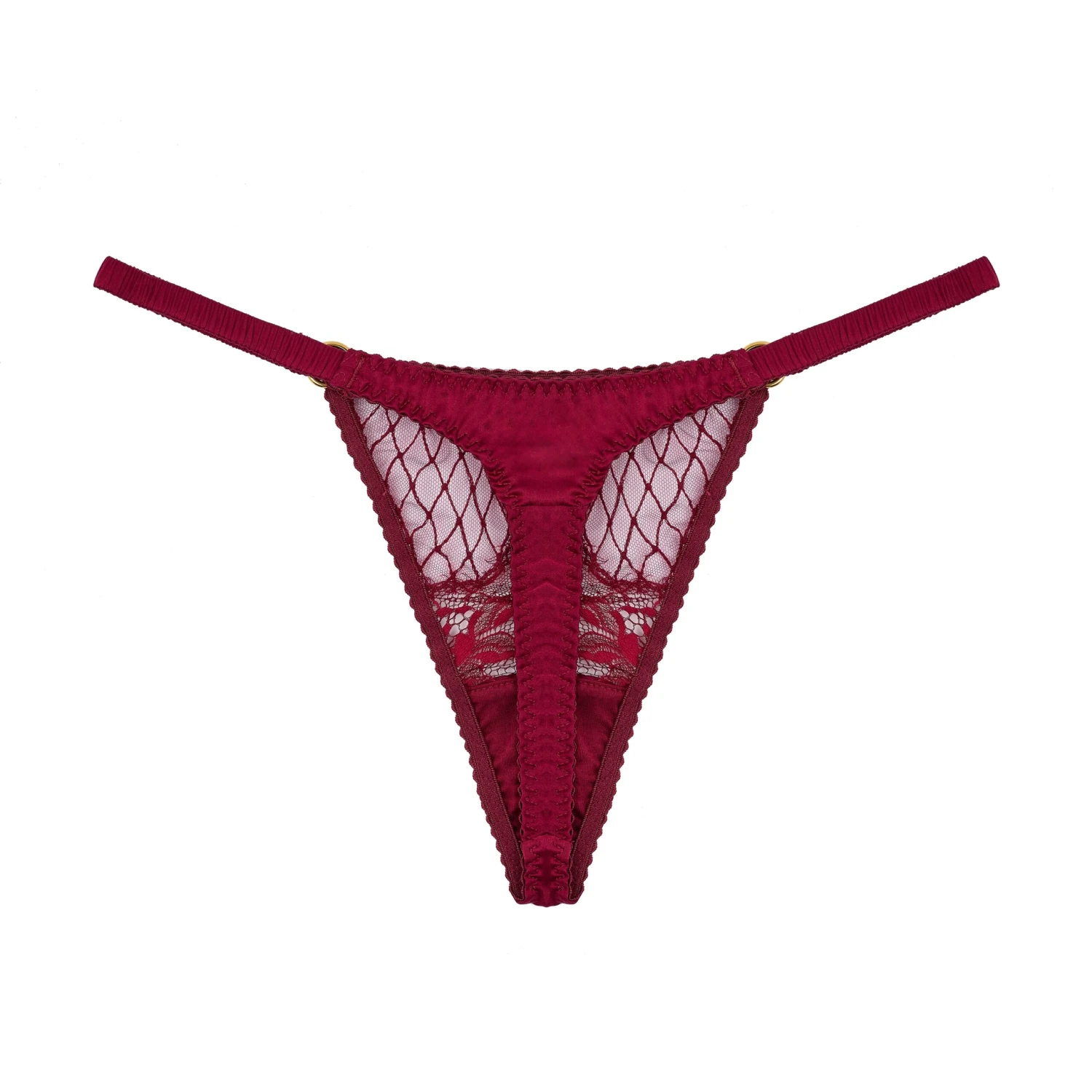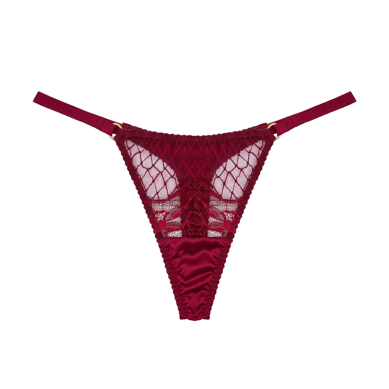 bespoke fishnet embroidery in a passionate shade of rouge, , fiery Brazilian lace brief, and our best-selling soft cup boudoir bra with irresistible back detailing.