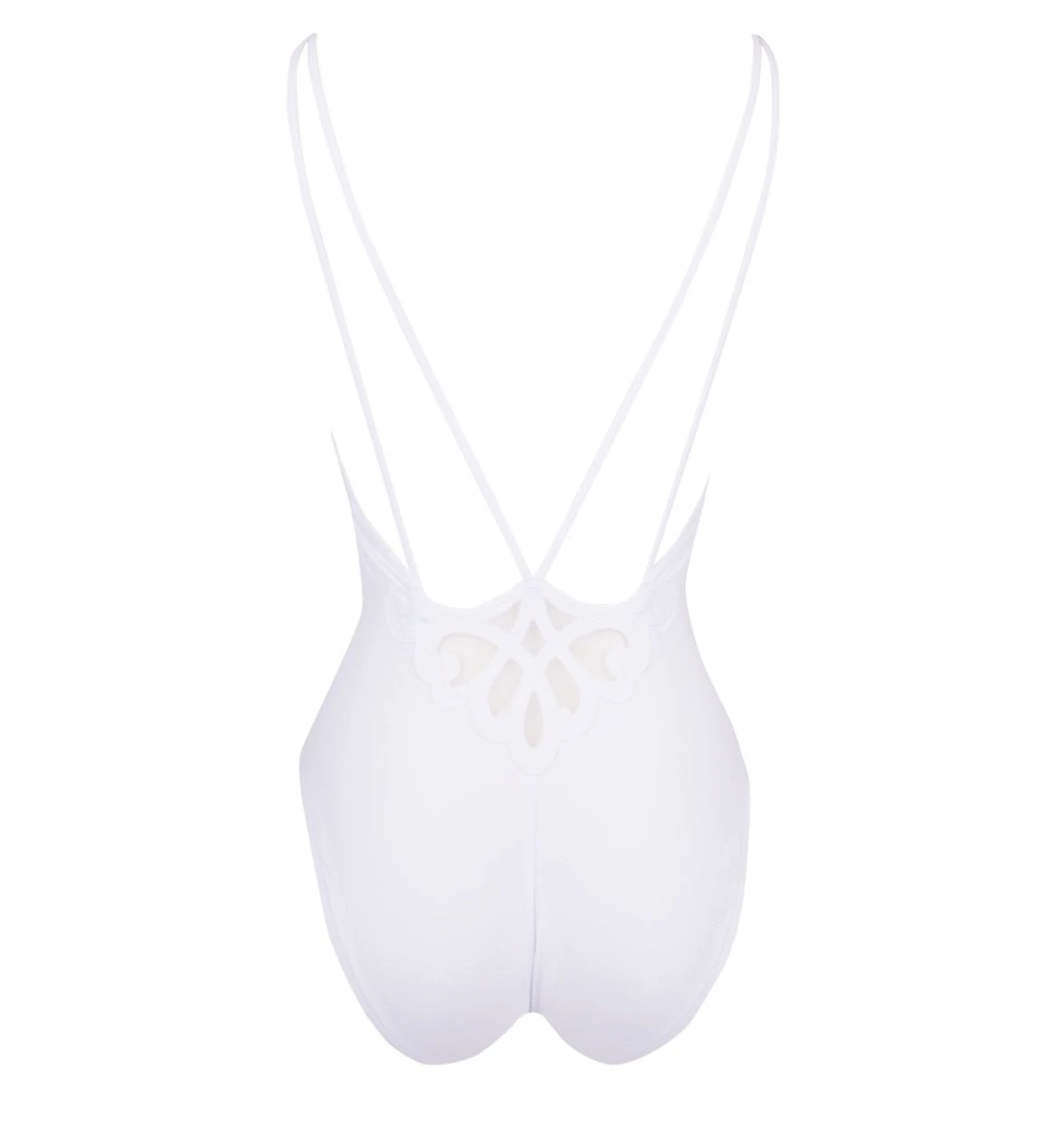 Lise Charmel Perfect Allure Swimsuit has a plunging neckline with thin adjustable straps. At the lower back the straps join an inlay of guipure. Removable foam from cups.