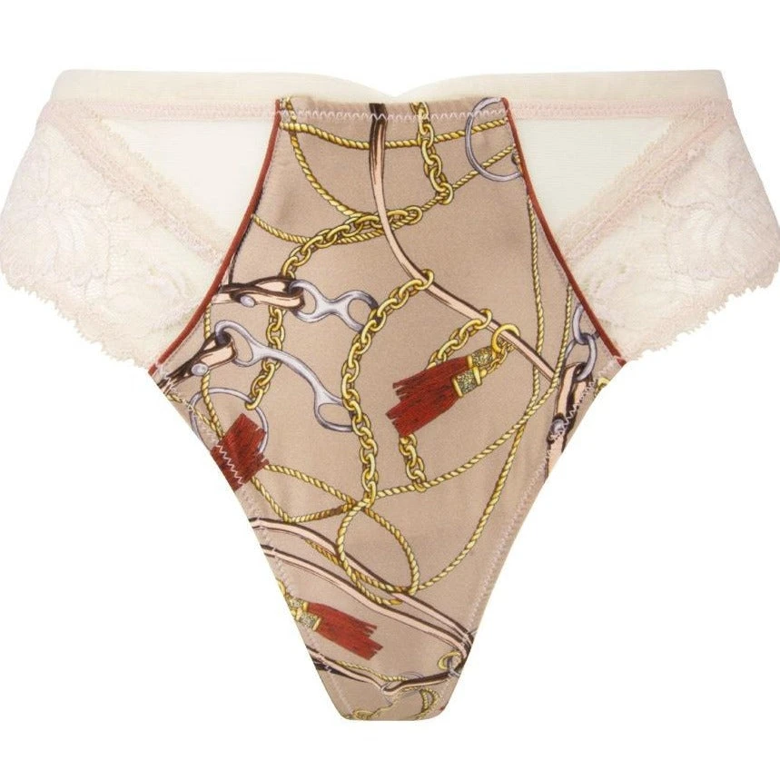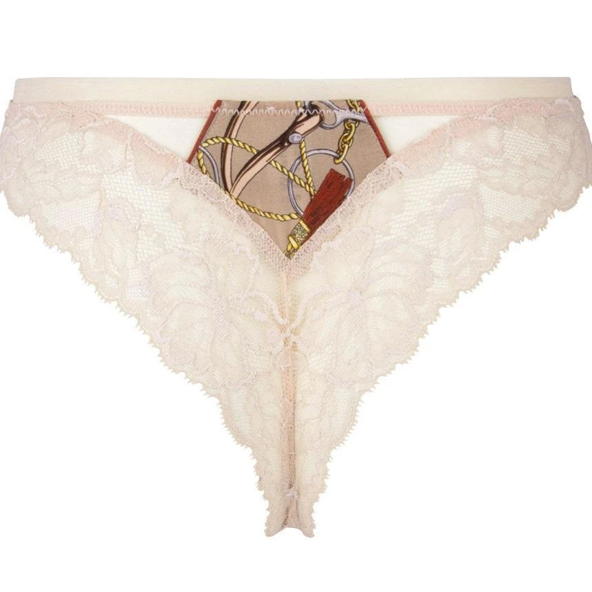 Lise Charmel Cavaliere Thong-This line of rare elegance evokes the love of freedom through a scarf print imbued with sensuality. A sumptuous Leavers lace dresses the curves and lets guess the skin in a delicate play of transparency. Its scalloped cut outs around the thighs and at the back embellish the silhouette.