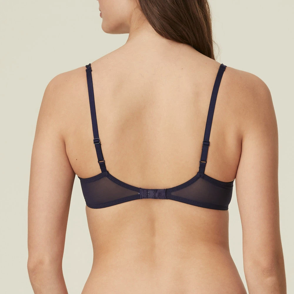 The Marie Jo Sakura Wired Balcony Bra with vertical seams gives you coquettish cleavage. With decorative embroidery and lace on the cups. Extremely feminine and sophisticated! Evening Blue is a deep, midnight blue with sophisticated pink accents.