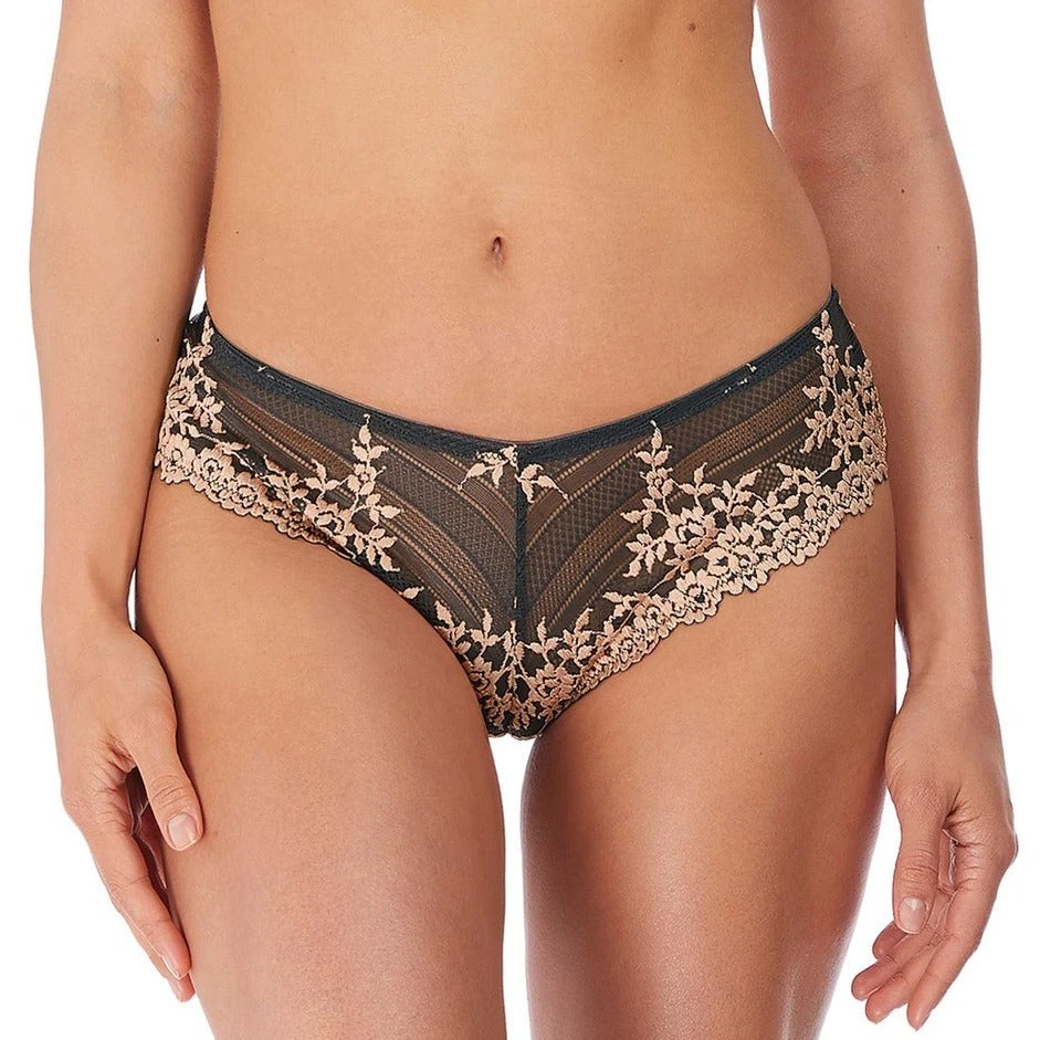 Wacoal Embrace Lace Thong – Crafted from complete stretch lace in an Ebony and Sand hue, the Embrace Lace Tanga offers a mid-rise fit with cheeky back coverage.