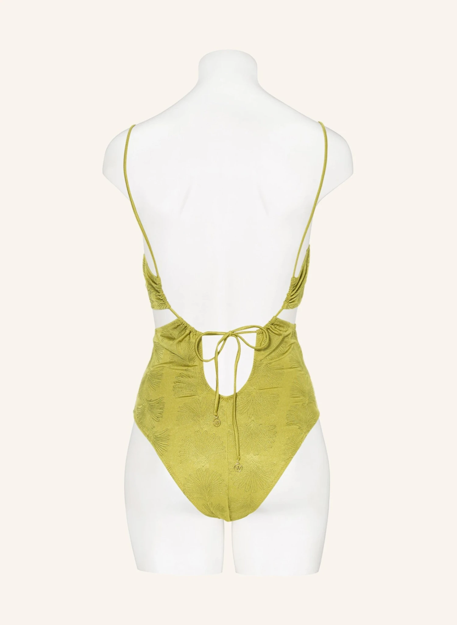 Watercult Satin Craft Cut Out Swimsuit – Subtle tonal three-dimensional effects create interest and newness. Exotic banana tree motifs are simplified, and vector styled to the purest outline. Iterated in a static manner the look turns super modern creating a new twist on the shiny satin base fabric. Feminine accents and bold details collide to a fashion-forward key look. Intricate details give a new touch to exotism as the golden elements connected by tiny hand-made braids. Multiple rings linking front and back panels of the suit are seductive features for exciting new swim pieces ready to be discovered.